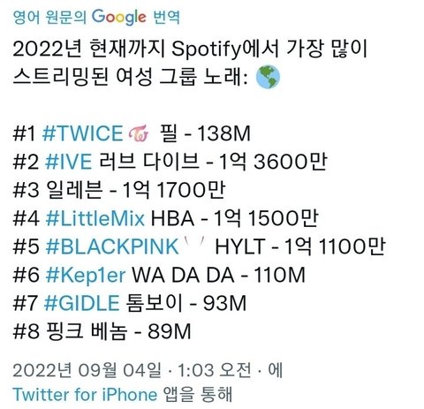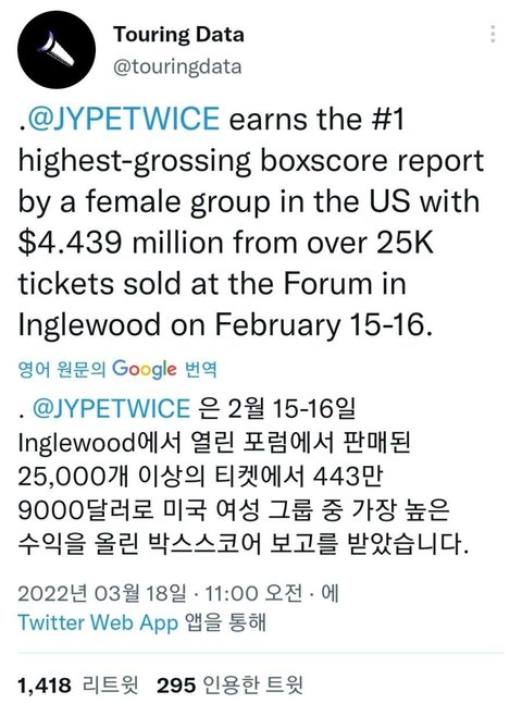 동엽신이 그랬지 미국에 아는 지인이 트와팬인데 콘서트가서 울컥했다고 외국 사람들이 한국말로 트와노래 떼창하는 거보고 콘서트 관객석이 빽빽하게 가득차있는데 노래 다 따라부르는 거보고 울컥 눈물이났다고 ㅋ 해외에서 외화벌이 잘 하고 케이팝위상을 계속 올려주고 있고 해외에서 호감형 그룹이라 앨범판매는 계속 더 상승하고 해외음원챠트도 올킬 빌보드 10 . 빌보드 200 에 케이팝 앨범 최다 기록 보유 하고 있고 열심히 활동 하고 무대에서 항상 최고에 무대만 보여주는데 왜 자꾸 지들끼리 지빠는 가수들보다 더 잘 나가고 기록 성적 매출이 수상이 다 쨉도 안되게 배로 많은데 ㅋㅋ 이렇게 대단한 7년차 아이돌 음원순위로 한 두번 이겼다고 트와 성적 기록 매출 수상 다 업고 지들이 다 이겼다고 발랐다고 지랄들이네 ㅋ 제발 트와만큼만 해 역대 기록 성적 대상 매출이 말해주자나 ㅋ ㅋㅋㅋ