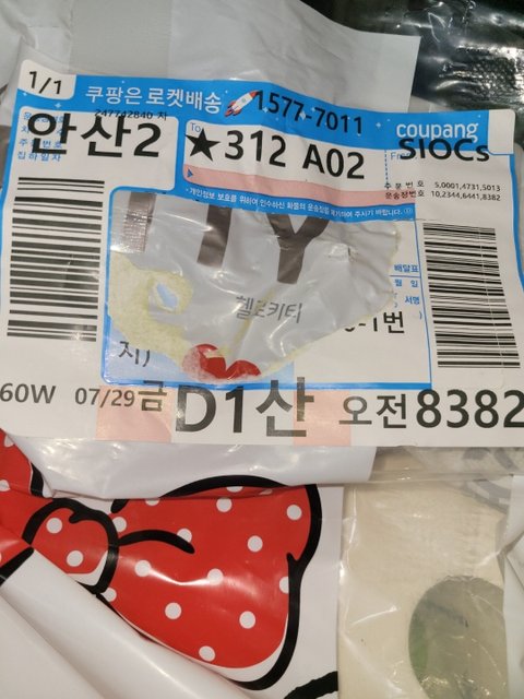 만약 송장에 적힌 주소와 이름 때문에 찝찝하다 하시면 그 부분만 따로 떼어 낼 수 있게끔 송장이 만들어져 있어서 그 부분만 떼어 내시면 됩니다. 사진속 떼어낸 부분 가장자리를 손톱이나 날카로운 물건으로 살살살 찌르면서 왔다갔다 하시면 떼어집니다.