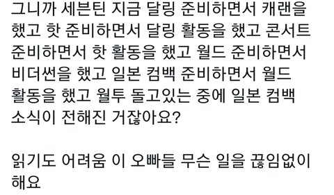 위버스는 또 어떤지 몰라요... 셉둥이들은요 진짜 하루에 한번 소통은 물론이고 셀카나 콘서트 끝나고 밥먹는것도 올려줘요 위버스라이브도 피곤할텐데 생각외로 자주 와주구요ㅠ