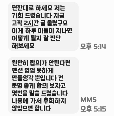 이 모든 일이 저의 부주의로 일어났기 때문에 계좌이체 했다는 문자와 같이 합의금 얼마를 원하시는지를 물었습니다. 그랬더니 그러면 300만원을 원하신다는 문자를 받았고, 그래서 저는 그러면 올리신 글의 저희 펜션 상호 다 기재된거는 어떻게 할거인지를 물었어요. 주인분은 그러면 글은 내리겠다고 하시더라고요. 하지만 저한테 협박이란 협박은 다 하시고 글에는 제가 방관자처럼 묘사가 다 되어있고, 저희 펜션은 상오며 허위사실로 유포가 다 되어있기 때문에 저는 더이상 합의는 어렵다 생각을 하며 이분한테 어려울거 같다 말을 하자 이분은 또 한번 저한테 그러더라고요. ‘죄책감도 모르고 잘못도 모르는 사람이고 펜션 문 닫게 할거’라면서요.
