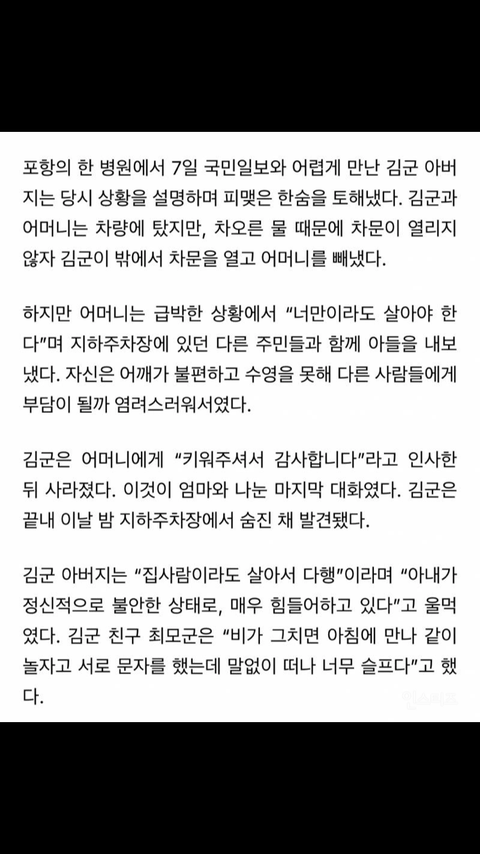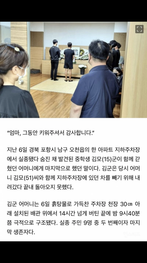 본인보다 소중해 본인 목숨 버려가며 살라고 내보낸 자식 본인만 살고 자식은 죽은 지금 엄마 심정도 어떻겠고 잠시 갔다오는 지하주차장까지 따라갈정도로 엄마껌딱지였다는데 그 위험한 상황에 저렇게 마지막 말을 하는 아들의 심정은 또어땠을까 기사보고 울었음 아내라도 살아돌아와서 다행이라고 말하는 남편분은 오죽할까 제발 자책은 오래하지 않으셨음 좋겠다 그 상황에서 최선을 다하신거라고 본인 목숨 버려가며 지키고 싶었던 아들일텐데 그 누가 어머니께 뭐라하겠음