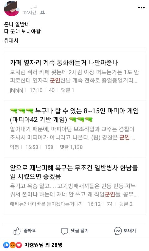 이러니까 남자들이 여자들 군대보내자고 하는거라고 하네요.