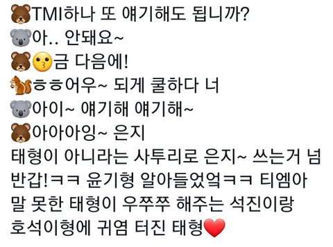 은지쓰는 태형이랑 은지 나오니까 알아듣고 웅성대는 슈가 지민 정국이 너무 웃김 ㅋㅋㅋㅋㅋ