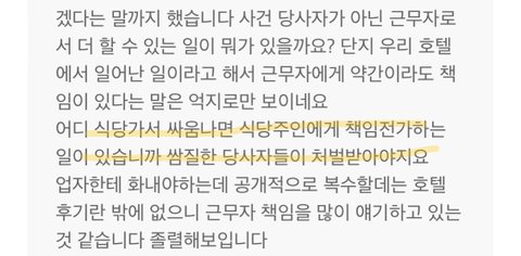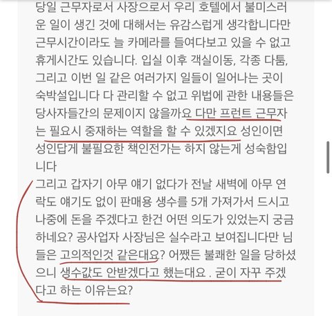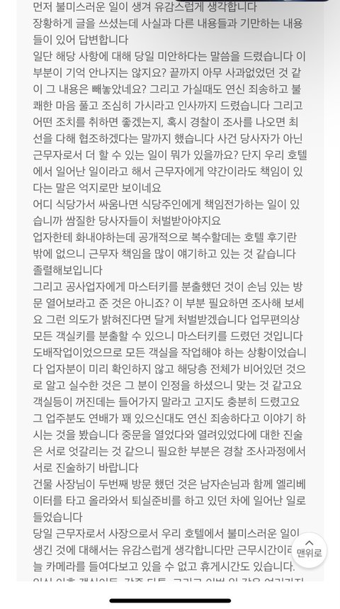 당일 근무자로서 사장으로서 우리 호텔에서 불미스러운 일이 생긴 것에 대해서는 유감스럽게 생각합니다만 근무시간이라도 늘 카메라를 들여다보고 있을 수 없고 휴게시간도 있습니다.(네 이 부분도 이해합니다. 이해하지만 이런 일이 생긴게 저희 잘못인가요?)