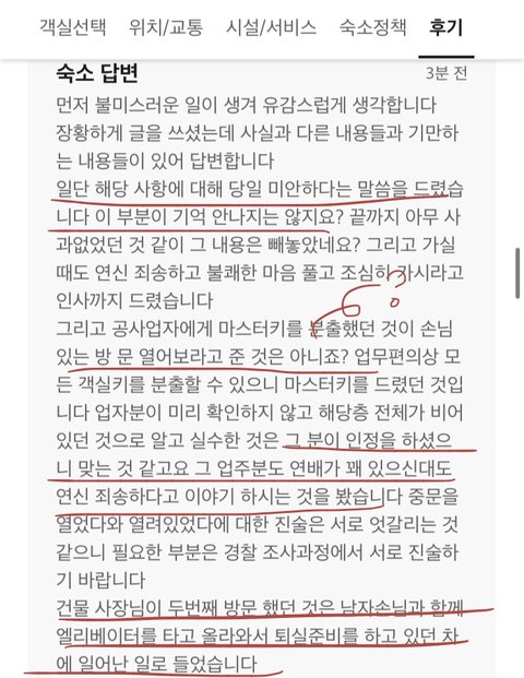 그냥 가만히 있으려고 했는데 후기에 남긴 댓글보니 진심으로사과하신것같지도 않네요ㅋㅋ 역시나가 역시나 저희가 괜히 화가 난게 아니였네요솔직히 처음부터 사과 제대로 하시고 불편하게 해드려 죄송하다숙박비는 환불해드리겠다 하셨으면 그냥 넘어갔을텐데 이건 뭐 대응이 똥이네요ㅋㅋ