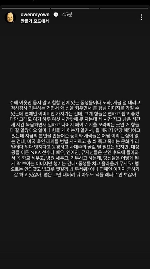 쌈디 돈으로 동생들 도와주면.. 그거 나중에 기억은 해주냐? 언급은 해줌? 입 싹닫고 난 언더그라운드에서 쫄쫄 굶으며 올라왔다~ㅇㅈㄹ할거 뻔하고 쟨 주고 난 안줬다 질투할거 뻔한데 대체 쌈디가 왜? 본인 생각에 그게 정의라면 본인이 성공해서 그렇게 할 생각을 해야지 저게 무슨 거지심보람ㅋㅋㅋ