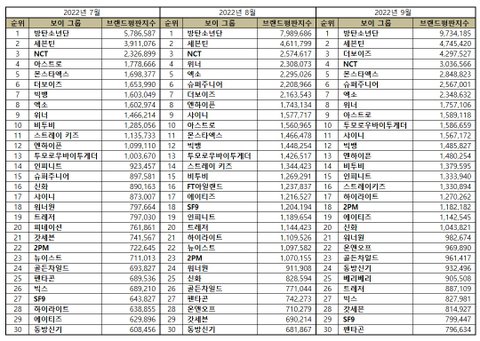 2022년 9월 보이그룹 브랜드평판 30위 순위는 방탄소년단, 세븐틴, 더보이즈, NCT, 몬스타엑스, 슈퍼주니어, 엑소, 위너, 아스트로, 투모로우바이투게더, 샤이니, 빅뱅, 엔하이픈, 비투비, 인피니트, 스트레이키즈, 하이라이트, 2PM, 에이티즈, 신화, 워너원, 온앤오프, 골든차일드, 동방신기, 베리베리, 트레저, 빅스, 갓세븐, SF9, 펜타곤 순으로 분석됐다.