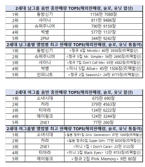 2세대 음원, 음반 기준 전부 TOP5