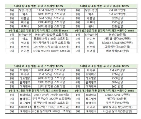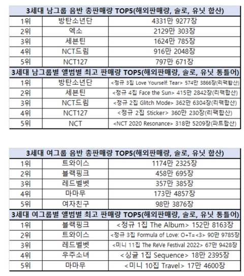 3세대 음원, 음반 기준 전부 TOP5