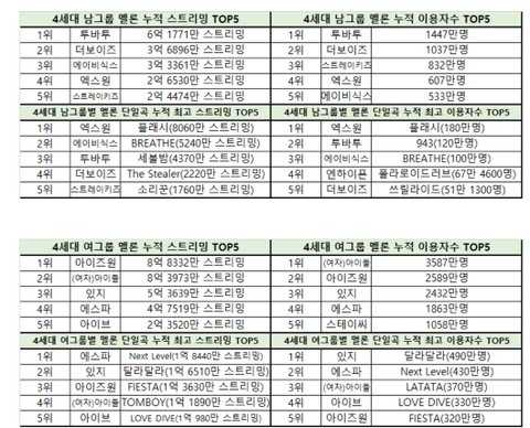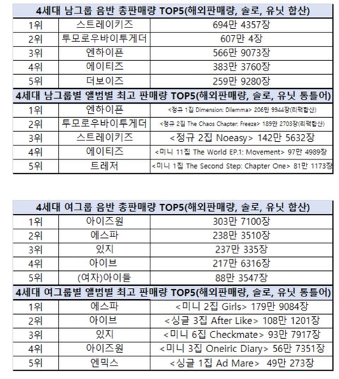 4세대 음원, 음반 기준 전부 TOP5