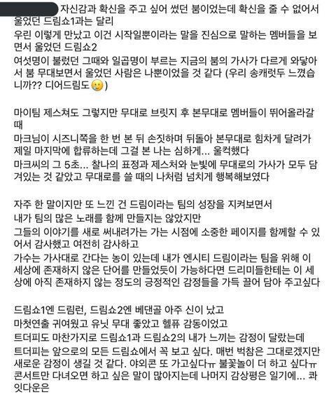 자신감과 확신을 주고 싶어서 썼던 붐인데 확신을 줄 수 없어서 울었던 드림쇼1과는 달리 우린 이렇게 만났고 이건 시작일뿐이라는 말을 진심으로 말하는 멤버들을 보면서 보면서 울었던 드림쇼2 … ㅠㅠㅠㅠㅠ