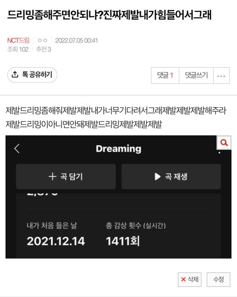 지금 보니까 2천번정도 들었더라 ㅋㅋㅋㅋㅋㅋ