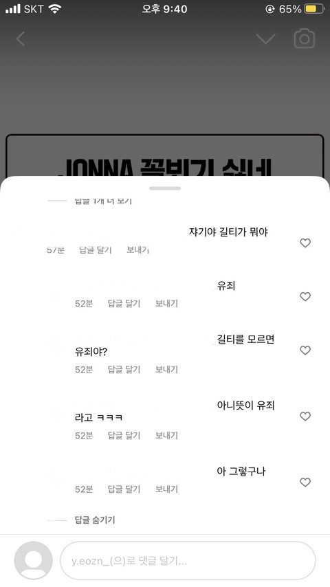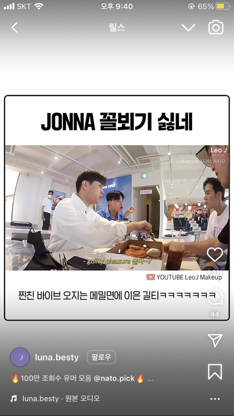인스타 보다가 레오제이 영상이 떴는데 거기 제주도 여행편에서 길티 플레져 얘기가 나왔는데 무심코 인스타 댓글을 봤거든? 근데 나 이 댓글 보고 진짜 꺽꺽 웃음ㅠㅠㅠㅠㅠㅠㅠ