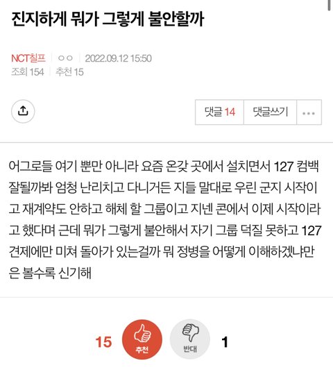 판 하루이틀 해? 저긴 원래 저랬어 어그로가 한바탕 하고 나면 드프로 몰아가고 정신승리 함 근데 드림 까는 건 자기들 아니고 어그로가 추천수 조작한 거라고 맨날 그래왔는데 뭐 그리고 우리가 상식적으로 지금 저기서 저짓을 할 리가 있냐? 콘서트 감동도 아직 다 빠져나간 상태에 그냥 편한 대로 생각하라 그래 상대할 마음도 없음