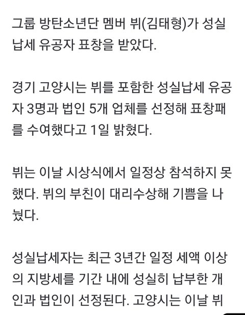뷔 3년간 성실납세로 표창
