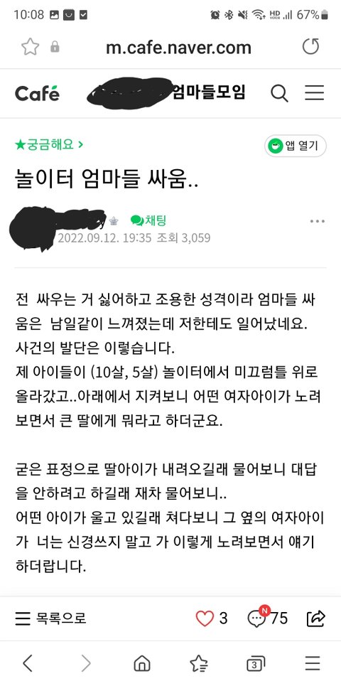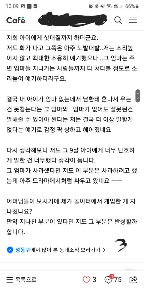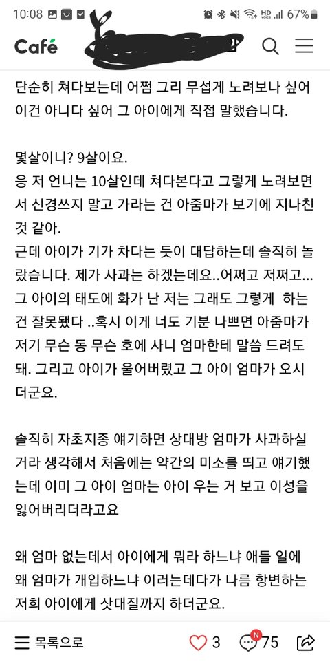 엄청 무섭게 노려봤다? 그거 가지고 남의 애한테 우리 애는 10살인데 어쩌구 하면서 너도 엄마 불러오라는식으로 말하고 잔소리할 일인가 싶어요.