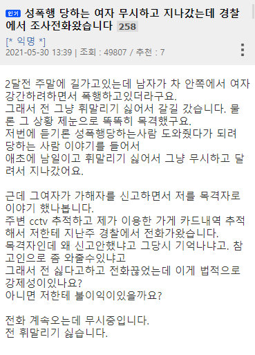 성폭행 당하는 여자 무시하고 지나갔는데 경찰에서 조사전화왔습니다