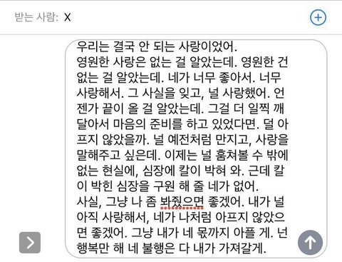 ㄹㅇ 둘다 이거랑 비슷한 길이에 비슷한 말투였음 개오글거려서 미련 다 사라지고 걍 웃겨보임 이제 ㅅㅂㅋㅋㅋㅋㅋㅋㅋㅋ