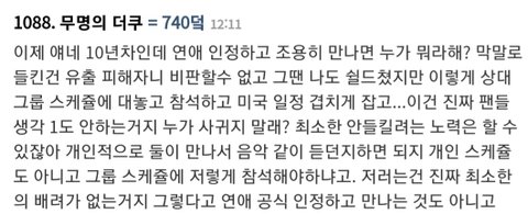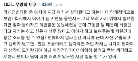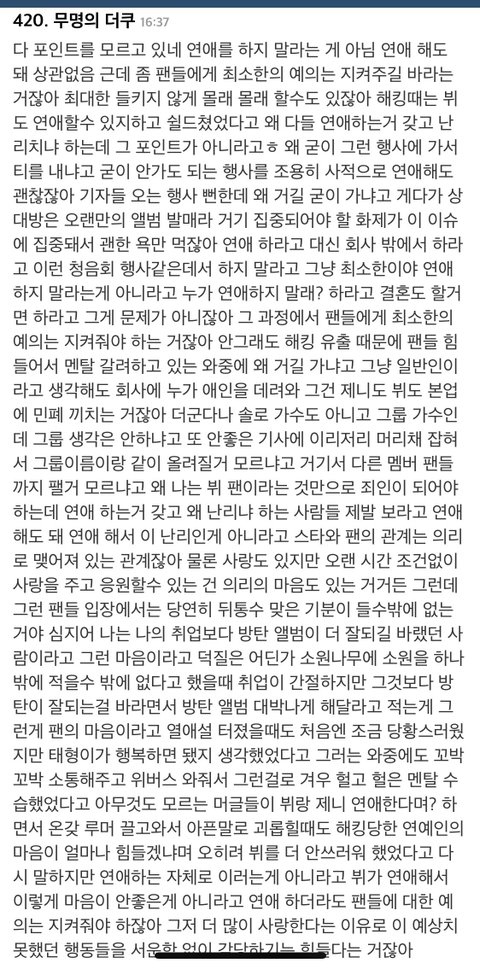 나는 뷔한테 화나는건 그건데. 한 2년된 늦덕이고 올팬이라고 생각은하지만 물론 최애랑 차애는 있음. 뷔는 아님. 이런 상태에서 뷔가 연애로 너무 어그로끄는걸 너무 길게해서 피로도가 쌓이고있음. 최차아니고 연차도있고 나도 나이도있고 그래서 그런지 타격없어서 흐린눈중인데 안그래도 요새 떡밥상태가 안좋은상태인데 중간중간 단체떡밥뜰때 뷔가 영상에서 빨리 끝내고 싶어하는걸 티낼때 이때 진짜 다른애들은 열심히 말하려고하는데 끊고 가려고해서 진짜 개빡침. 다른애들은 가야겠어요. 해도 이유를 말해주면서 가려고해서 우쭈쭈 열심히 하구와 이게 되는데 뷔는 냅다 여기까지! 이런느낌. 최근 달방 텔파밥먹으면서 자르는데 진짜 개빡침222. 혼자는 뭔짓하도 상관없음. 근데 그룹할때는 정신줄잡아라. 다른애들까지 영향가니까.