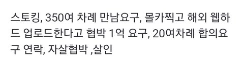 이거 신당역 역무원 살해남이 저지른짓임.. 저짓거리 할때 초반에 잡아서 처넣었으면 피해자분 지금 살아있었을지도 모른다는 생각 들어서 너무 안타깝더라 저렇게까지 사람 괴롭힌 남자가 처벌 제대로 안받고 자유롭게 돌아다니니까 결국 사람 죽는 결과까지 가는거지 스토킹, 불법촬영하고 협박은 바로 엄벌 때려야되는데