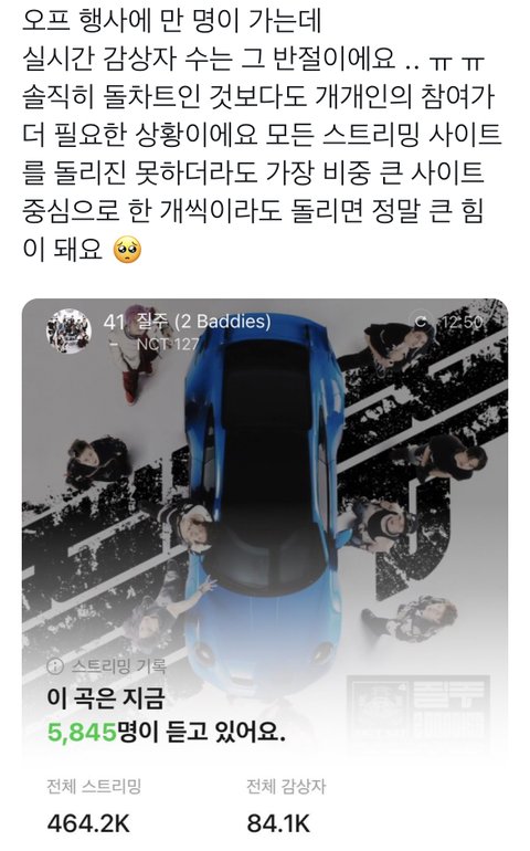 어제 오프 쇼케도 만명이 넘게 갔는데 스밍하는 사람이 절반임... 나는 안해도 되겠지 하지말고 나라도 하자!! 생각으로 하자 그래도 지금 올라가고 있어서 잘하고있다