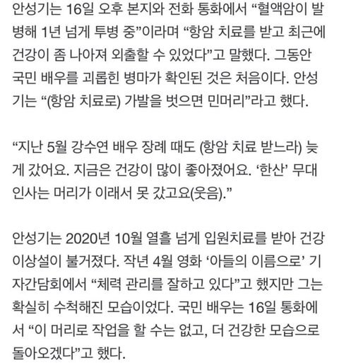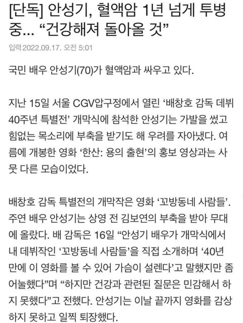 배우 안성기, 혈액암으로 1년 넘게 투병 중
