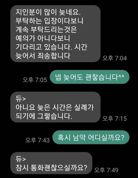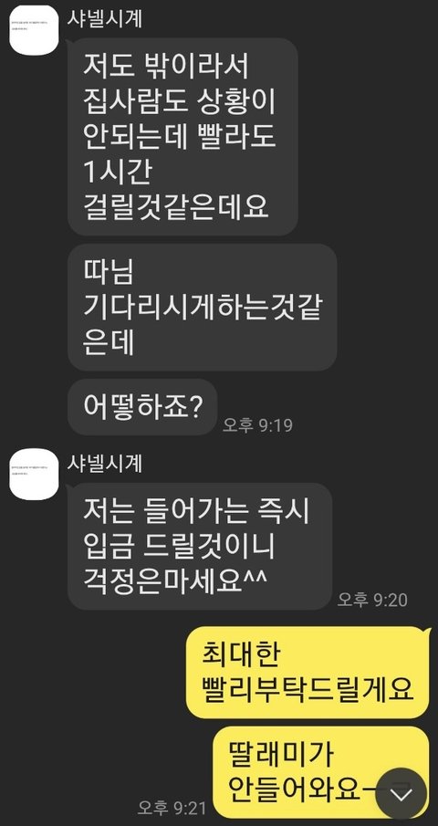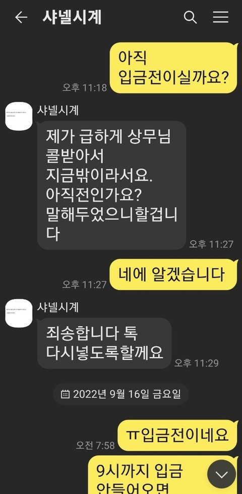 회식이 있다며 10시 30분 ~ 오전 8시 30분까지 입금을 하겠다가 미루다가