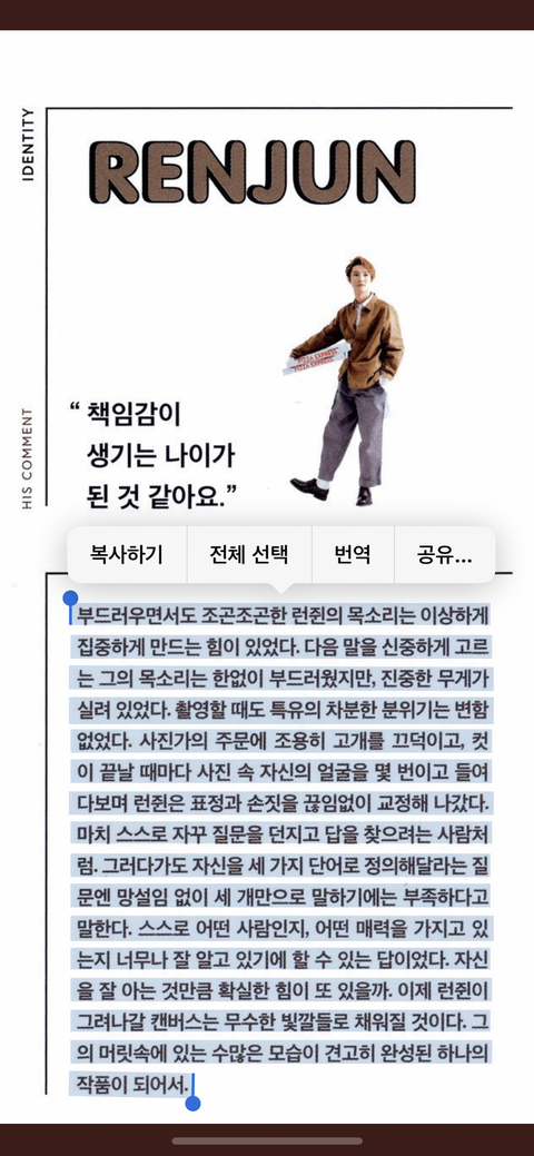 19년도 인터뷰긴 한데 런쥔이가 대답하는 인터뷰 내용도 너무너무 좋지만 서론에 인터뷰어들이 말해주는 런쥔이가 좋아서 화보나 인터뷰 앞으론 좀 더 많이 보고싶음