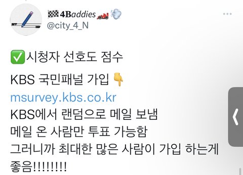 신청 30초컷 꼭 해줘 랜덤으로 메일 보내는데 최대한 많이 보내야 우리칠프들이 투표권 많이 받아갈 확률 높아짐 꼭 해주라 https://msurvey.kbs.co.kr/