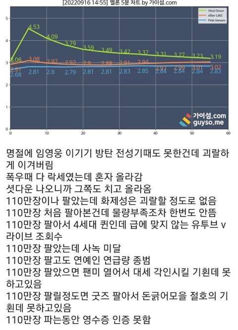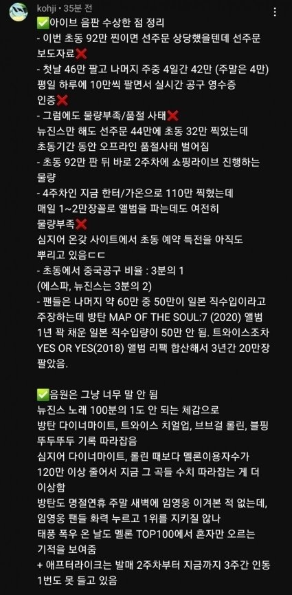 럽다 초동33 총판70이상에 앺라 초동92 총판115이상인데 그럼 스타쉽이 활동 끝난 앨범을 굳이 아직까지 사재기 하고있다는 소리임? 병ㅠ신도아니고 뭔