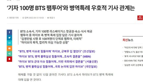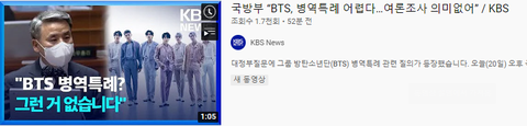 그냥 간다고 자기들이 입장 밝히면 모든 논란이 다 끝나는데, 입 꾹 닫고 은근슬쩍 정치권이랑 언론한테 티 내면서 군면제 해달라고 시그널을 쳐 보내니까 욕을 먹지. 그냥 조용히 갔으면 솔직히 공익을 가더라도 어느정도 이해는 해줄 수 있었는데 그간 한 짓들이 너무 괘씸해서 그냥 북한이랑 대치하는 최전방 GOP 보내서 빡세게 굴리고 고생시켜라. 당장 사람이 없어서 손가락 잘려서 없고 암 걸려서 투병 중인데도 군대가야 하는 게 현실인데 방탄이 뭔데 특혜를 받아서 군면제 되야 됨?