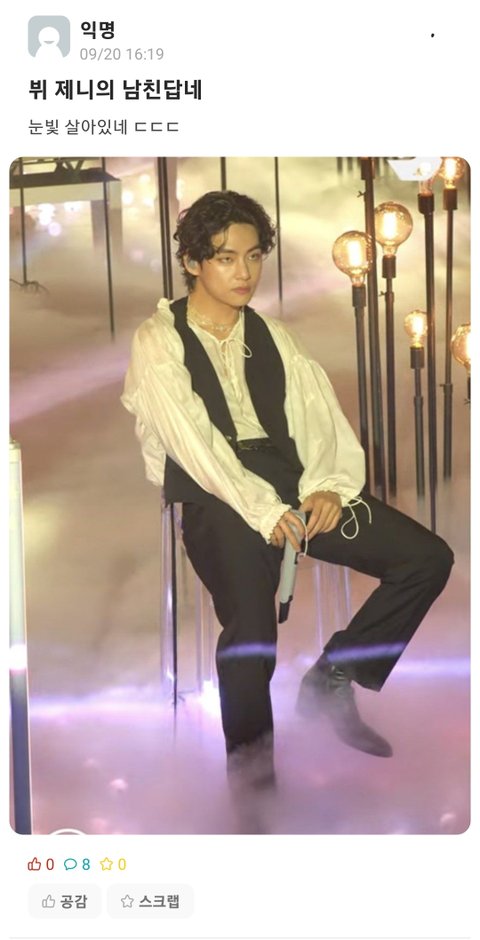 뷔 존잘인거 당연한 얘기고 왜 이 글 댓에서 표정 얘기는 하는지 모르겠으며 고작 저 사진 하나로 표정궁예 성격궁예하는거 너무 족같다고 생각해