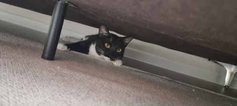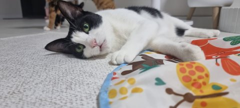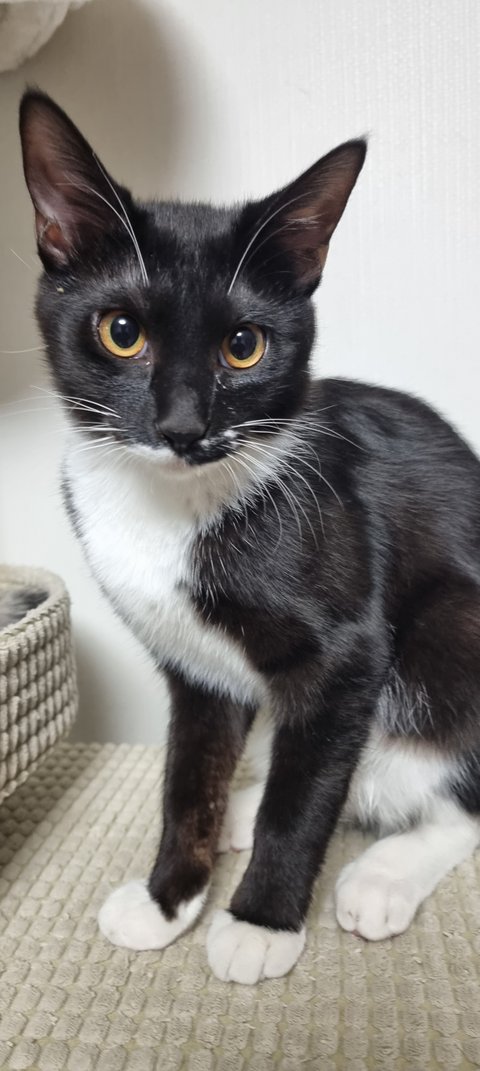까만코트에 흰색목도리와 흰색 양말을 신고 있는 녀석입니다. 아주 호기심이 많고 애교가 많은 무릎냥이랍니다.