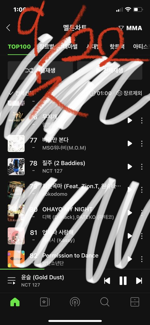 12시 차트 29위 아녓어? 갑자기 왜 78위고 순위 상승하거나 하락하면 붙는 표시는 왜 모든 음원에 다 없는 거야?