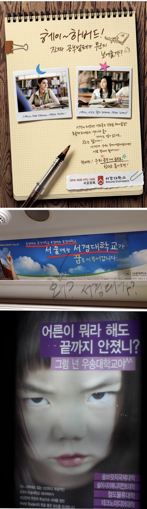 기억에ㅜ남는 광고..? 굳이 그걸 대학에 적용해야 됨..? 판에도 이 대학 지잡이야? 인식 어때? 이런 글 ㅈㄴ 자주 올라오는 거 보면 수험생들이 원서질 할 때 중요시 여기는 것 중 하나가 대학 네임 벨류인 거 알 수 있는데 아무리 이름 알리고 싶다 하더라도 굳이 저렇게 싼티 나는 방식을 썼어야 했나 인식만 한층 더 지잡 같아질 뿐임,, 어그로 끌린다는 게 페북에서 과대광고하는 상품 같은 데에나 적용되는 거지 대학을 웃기다고 인상적이라고 특이하다고 선택하난 건 아니잖어 아무리 전문대라 하더라도 선배들 실적이든 취업 현황이든 수상이든 보고 고를텐데 내가 호텔조리학과 지망하는 학생이라면 적어도 이 대학은 피하고 싶을듯