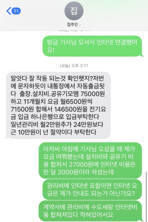 자취 계약서에 관리비에 수도세와 인터넷비를 포함한다는 조항이 있어 내가 공유기+기사님 출장비 내는 것은 이해가 가나 인터넷 비용은 왜 내야하는지 모르겠다고 하자 (두번째사진참조)문자를 받음