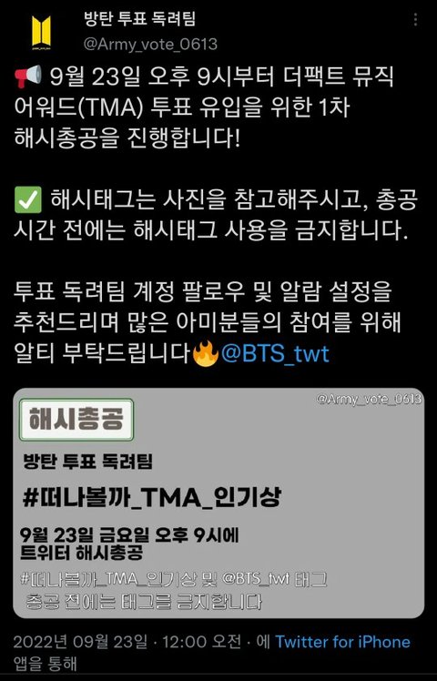 이따 9시에 인기상 투표 해시 총공 있어