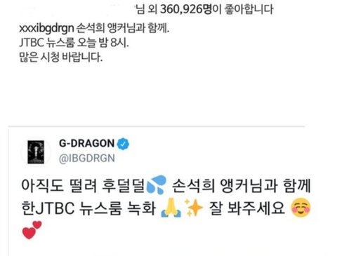 ㅋㅋㅋㅋㅋㅋ뉴스룸 출현당시 같은날 올린 인스타 (지드래곤이 올림)vs 트위터(권죵이 올림) 온도차이 ㅋㅋㅋㅋㅋㅋㅋㅋㅋ아니 자아가 두개냐구여ㅠㅋㅋㅋㅋㅋㅋㅋㅋㅋㅋㅋㅋㅋ