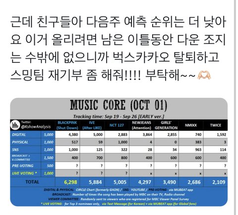 오늘보니 점수표랑 똑같던데 담주도 가망없을듯