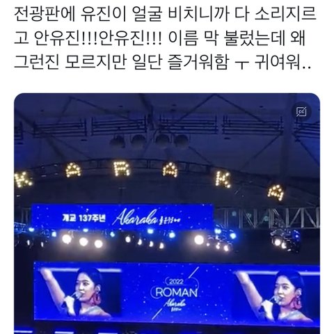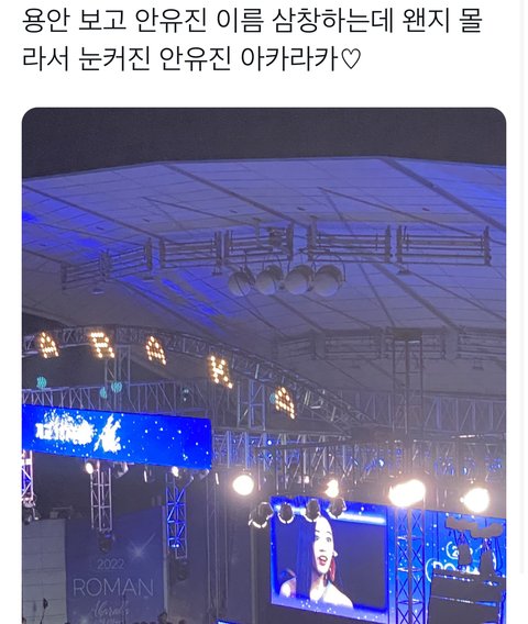 그냥 전광판에 얼굴뜬게 이뻐서 사람들이 안유진 이름 삼창 해줬는데 자기는 암것도 모르니까 걍 눈이 동그래짐ㅋㅋㅋㅋㅋㅋ