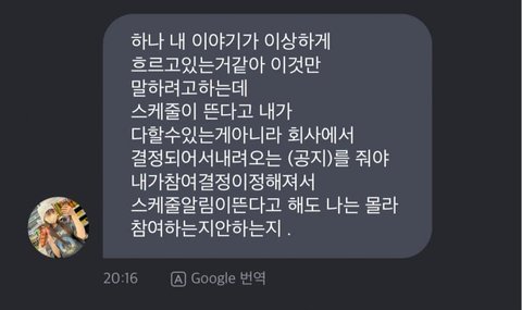 그리고 같은 멤버가 팬들이 물은 질문에 답한 내용. 12명이 있는 단톡에 공지를 해줬다고 하는데 이달소가 12명이라서 당연히 다 같이 있는 단톡이라고 다들 생각했을거임 근데 정작 츄는 공지를 못받음. 그래서 저 12명 단톡방이 매니저 1명 + 츄를 뺀 나머지 멤버 11명이 있는 단톡방이 아니냐는 말들이 엄청 나옴.
