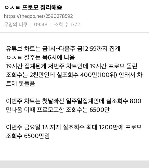 2주차집계: 6500만 조회수중 실조회수 800만 측정 차트인.