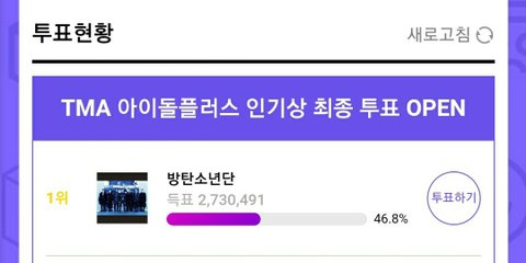 나 어제 오전에 투표할때까지만해도 2등이었는데 언제 1등돼쒀!!! 아 머릿수도 있는데 이제 투표좀 열씨미 하자곸ㅋㅋ큐ㅠㅠㅠㅜ 1등 됐다고 안심하지말고 끝까지 쭉 달리자!!!!