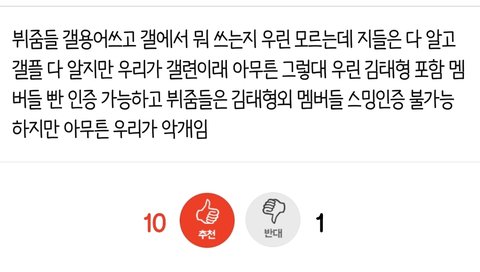 개인팬이나 악개가 김태형 노래 스밍할리도 없고 우린 맨날 김태형빨았던거 인증했으니까 뷔줌들아 너네가 이제 악개아닌 인증해봐 너넨 못하지?ㅋㅋ 김태형 탈빠한거 그냥 부정하고 싶어서 타멤들 머리채잡는거 내가 다 민망하고 공수치오니깐 그만좀해 ㅂㅅ 들아 김태형 빨때도 같판 아줌마들이 제일 싫엇어 너네때문에 어린팬들 다 탈덕하는건 모르지?
