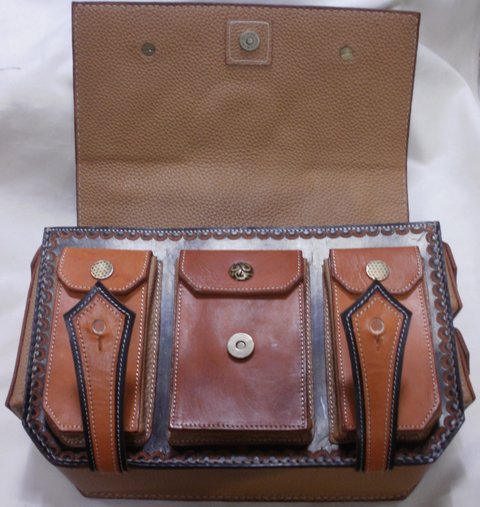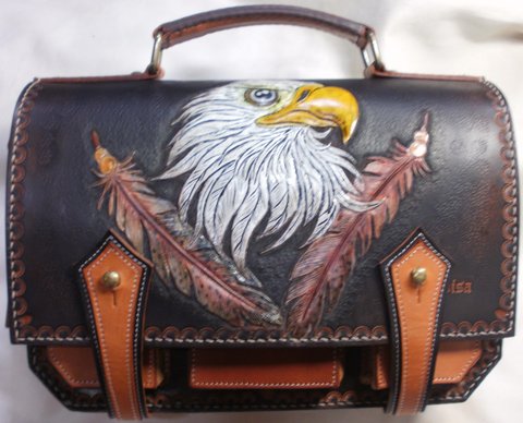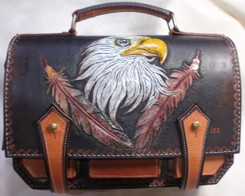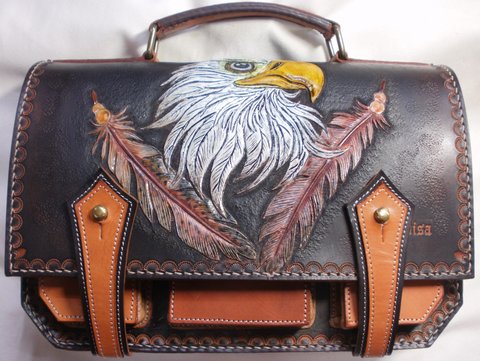가죽에 독수리와 깃털 디자인을 카빙하고 다크브라운 컬러와 탄 컬러로 천연염색하여 수작업으로 제작한 핸드메이드 토트백 겸용 서류가방 또는 카메라백으로 사용 가능한 다용도 천연가죽 백입니다.(마디샤)