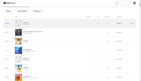 블랙핑크 셧다운 스포티파이 스트리밍 글로벌 주간 1위
