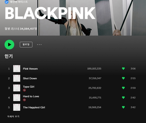 Spotify Global Blackpink 지수 제니 로제 리사 블핑 블링크 Streaming