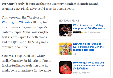 정확히는 스테판커리 선수가 >그래미 노미된 뮤지션<을 만날 계획이라고 기사 떴고 그 이후에 윤기라는게 밝혀짐 ㅈㄴ간지