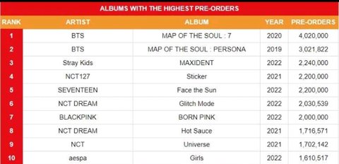 케이팝 아티스트 앨범 선주문량 순위