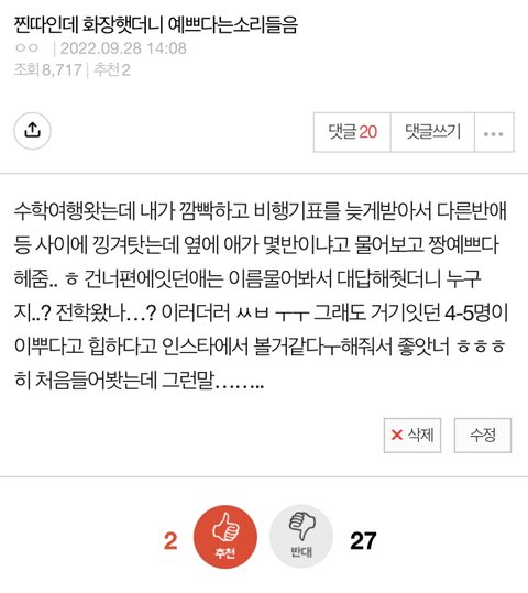 판애들은 찐딴데 화장하고 예쁘다는말 들엇다는걸 왜케 싫어해..??
